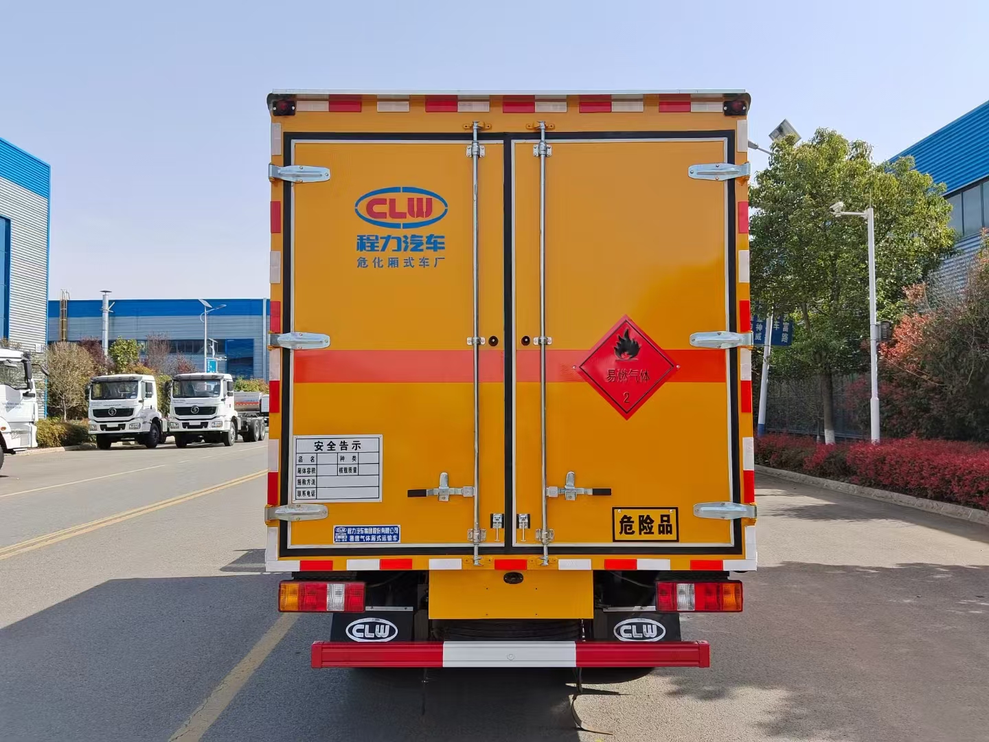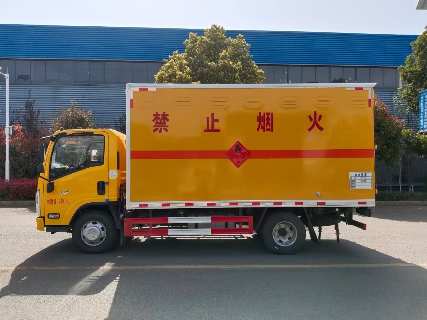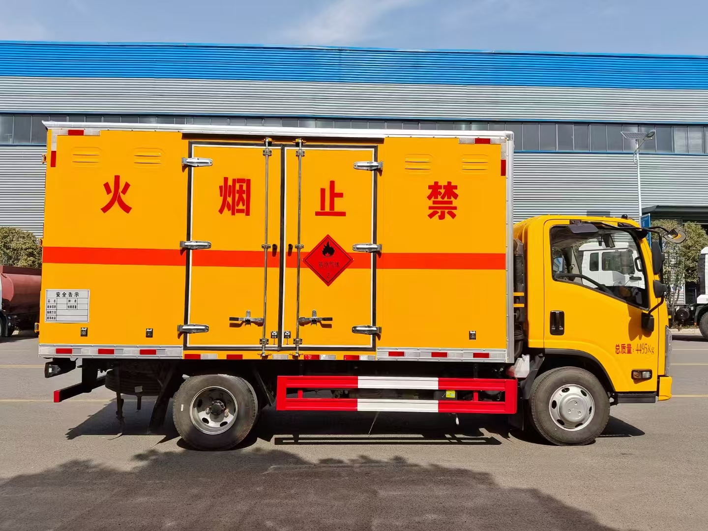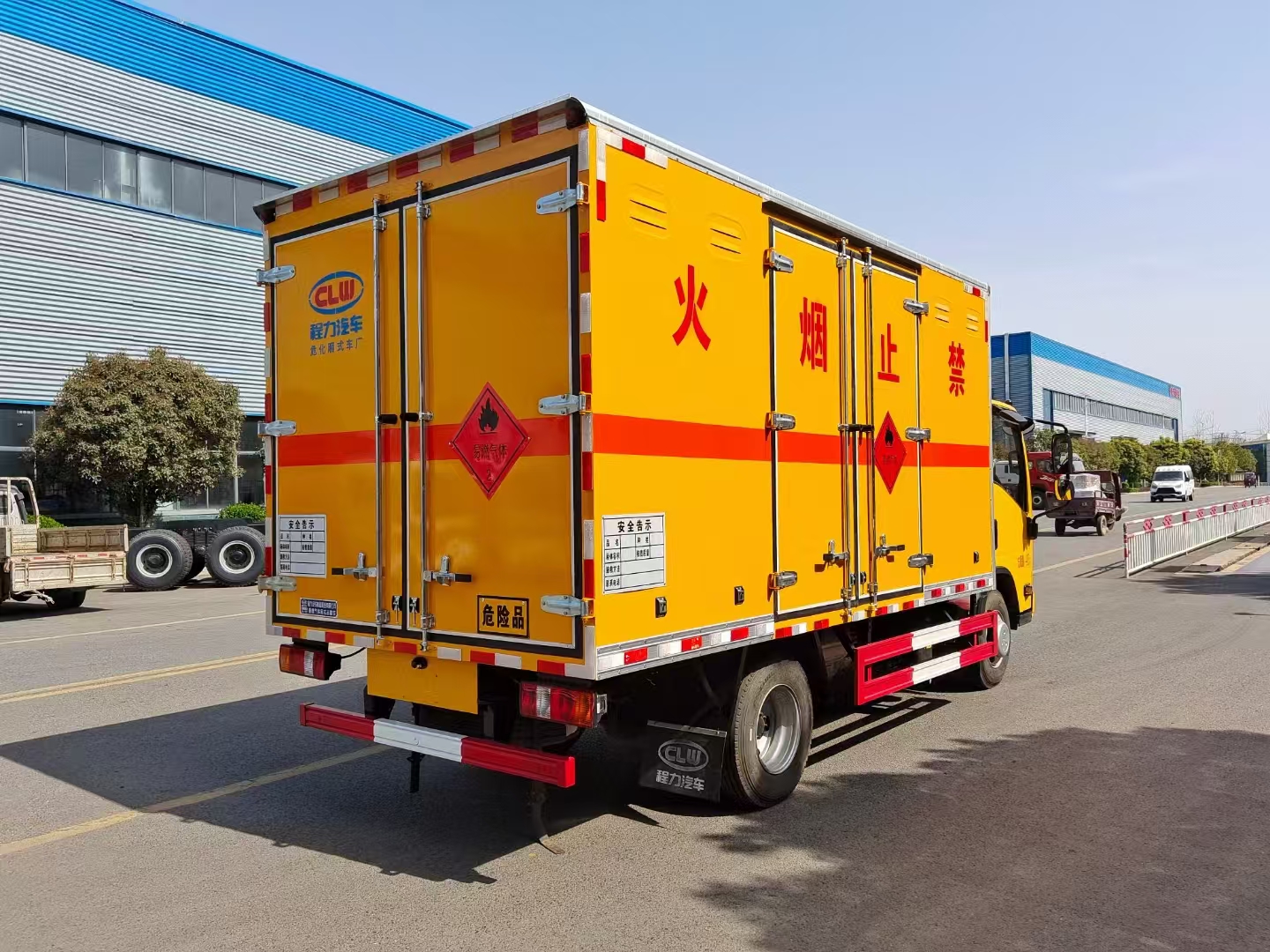 | 貨箱配置 | 廂體為雙層金屬骨架結構,外板采用冷軋鋼板,中間填充阻燃泡沫,內飾為鋁板。底板為平板上鋪防靜電膠皮。廂內兩側加裝固定貨物臥環(huán),門框帶防盜報警器,頂部帶煙霧報警器,廂體右側選裝側門,隨車配2個滅火器,危險標志牌,防火帽,危險品三角頂燈。 (選裝瓦楞板貨箱) (尾部可選裝液壓升降尾板) | ||