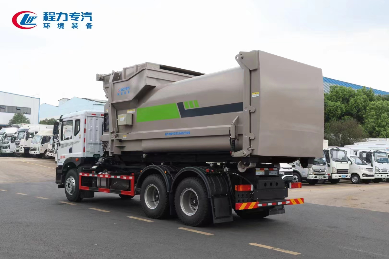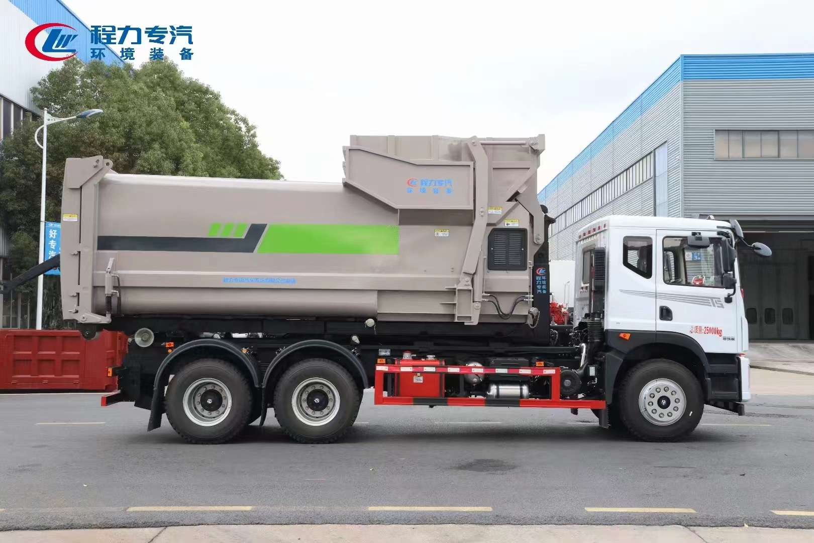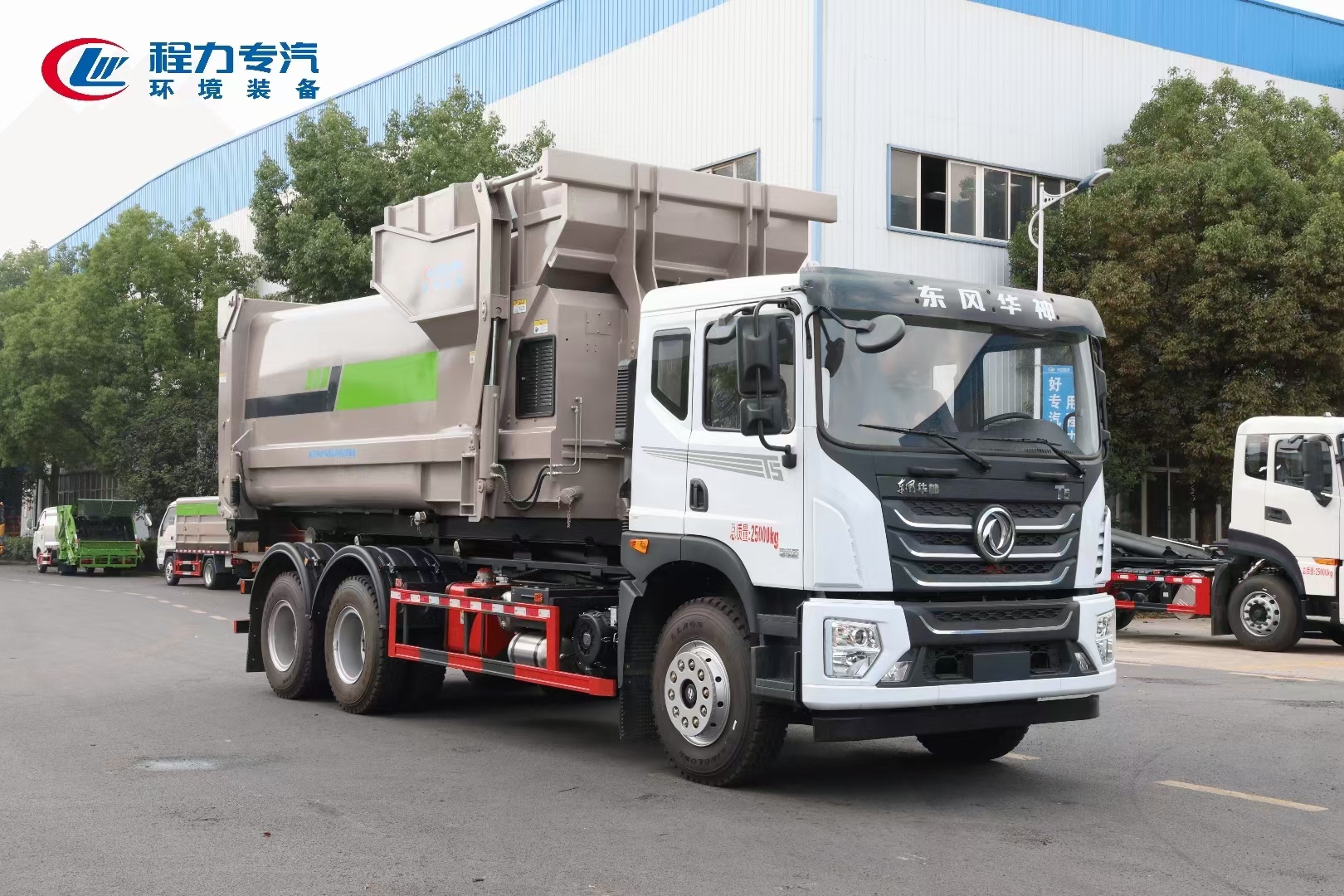 ??????湖北程力汽車:程力專汽東風(fēng)華神后雙橋勾臂垃圾車+移動壓縮箱產(chǎn)品型號及參數(shù)配置,程力專汽東風(fēng)華神后雙橋勾臂垃圾車+移動壓縮箱高清圖片,程力汽車系列程力專汽東風(fēng)華神后雙橋勾臂垃圾車+移動壓縮箱最新報(bào)價(jià)請撥打客服熱線。車輛主要配置 產(chǎn)品名稱: 程力威牌CLW5253ZXXBHJ車廂可卸式垃圾車 外形尺寸: 828025503170(mm) 排放水平: 國六 貨箱尺寸: (mm) 總質(zhì)量: 25000(Kg) 接近/離去角: 15/19,15/20,15/21() 額定質(zhì)量: 14250,14185(Kg) 前懸后...